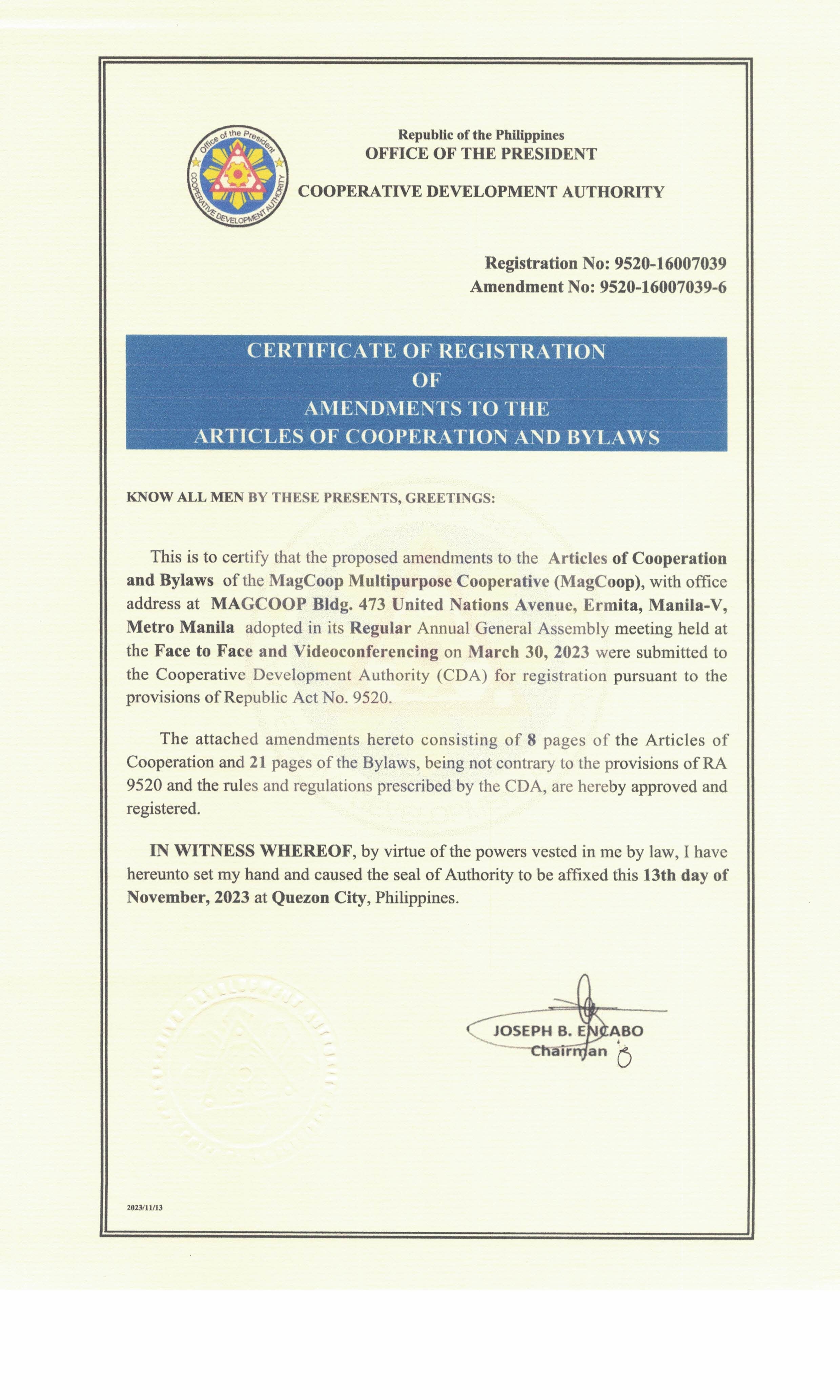 The following documents provide documentation on the purpose and authorization of MagCoop Multipurpose Cooperative to conduct lending and financial service activities.